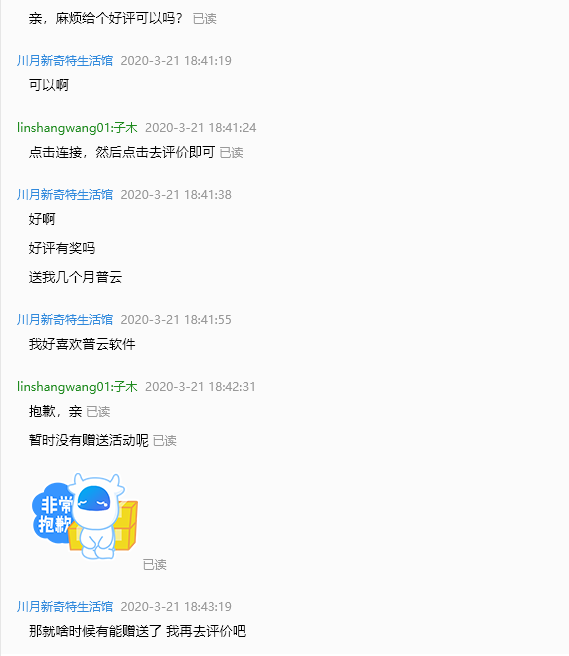 當他(tā)回複“謝(xiè)謝(xiè)老(lǎo)闆”的(¶de)時(shí)候,我會(huì)心一(yī)笑(xiào),不(bù)愧是(shì)普雲交易高₹(gāo)級版的(de)用(yòng)戶,眼光(guāng)好(hǎo),素質還(hái↓)高(gāo),心裡(lǐ)美(měi)滋滋。還(hái)給他(tā)發了(le)評價鏈接,想著(zhe)我服務這(zhè)麽好(hǎo)給個(gè)好(​hǎo)評吧(ba)。結果: