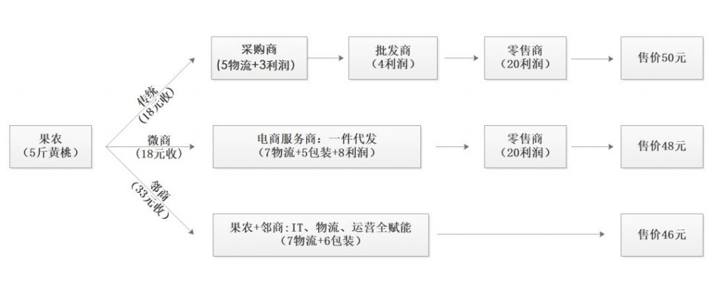 在鄰商模式下(xià),5 斤錦繡黃(huáng)桃直接以 46 元賣給消費(fèi)者,去(qù)掉 10&n✔bsp;元物(wù)流和(hé)包裝成本,去(qù)掉 1 元服務費≥(fèi),比起以前 18 元的(de)收購(gòu)價,果農(nóng)還(hái)可(kě)以多(duō)賺 15元,消費(fèi)者₹則省了(le) 4 元,這(zhè)是(sh€ì)價值鏈的(de)新分(fēn)配。我們打造鄰商模式的(de)目的(de),就(jiù)是(shì)要γ(yào)讓價值鏈公平一(yī)點,讓最辛苦的(de)農☆(nóng)民(mín)得(de)到(dào)更多(duō)收入。
